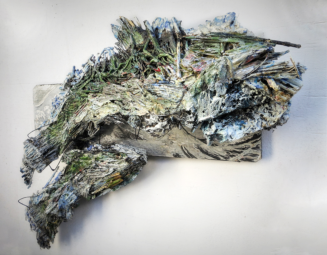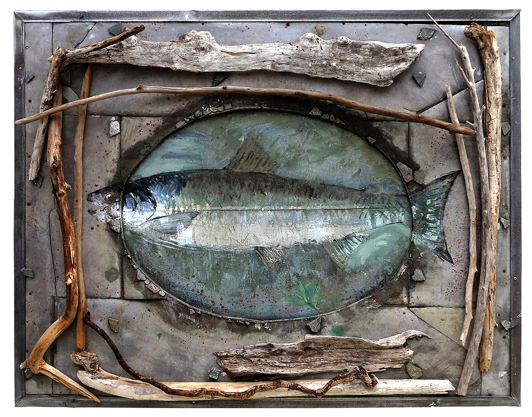 “Jumping Salmon” 14 w x 26 h x 6 d” formed and painted straw – $1000